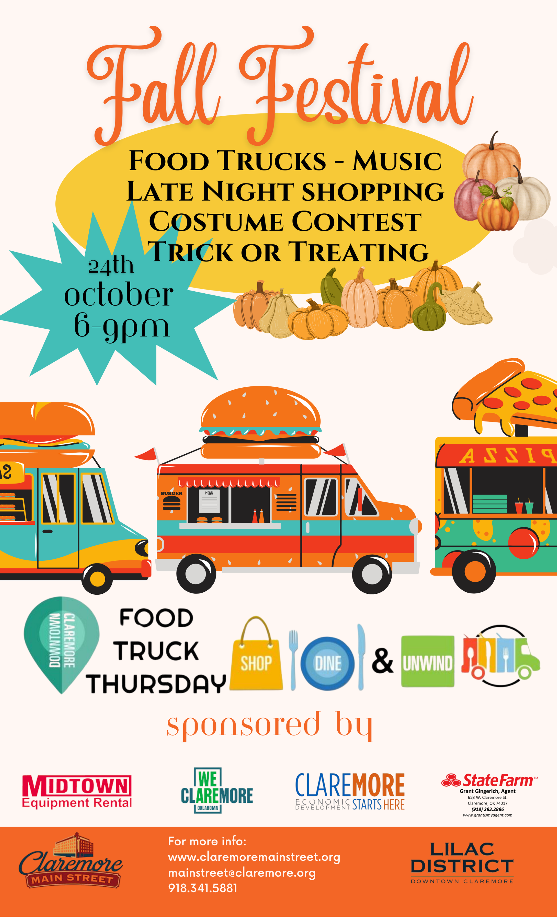 Head to downtown Claremore September 21st for Food Truck Thursday, monthly food truck and shopping event!