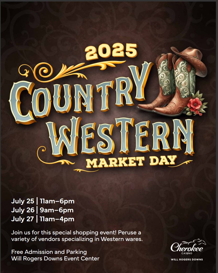 Will Rogers Downs Event Center will host Country Western Market Day, Friday July 25th from 11AM -6PM and Saturday July 26th 9AM-6PM.